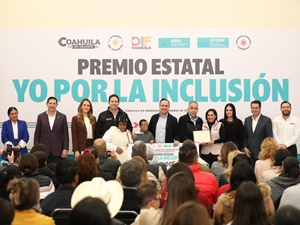 Entrega gobernador el premio estatal "Yo por la inclusión". Saltillo, Coahuila de Zaragoza; a 10 de noviembre de 2025.- Al entregar el premio estatal Yo por la inclusión, el gobernador Manolo Jiménez Salinas reiteró su compromiso por trabajar día con día para reconocer, visibilizar y fortalecer las acciones, proyectos, y buenas
