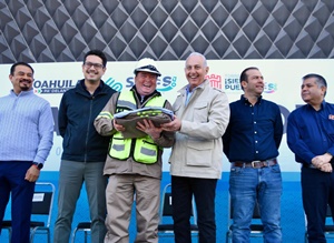 Román Alberto Cepeda González entrega uniformes al personal del SIMAS Torreón.